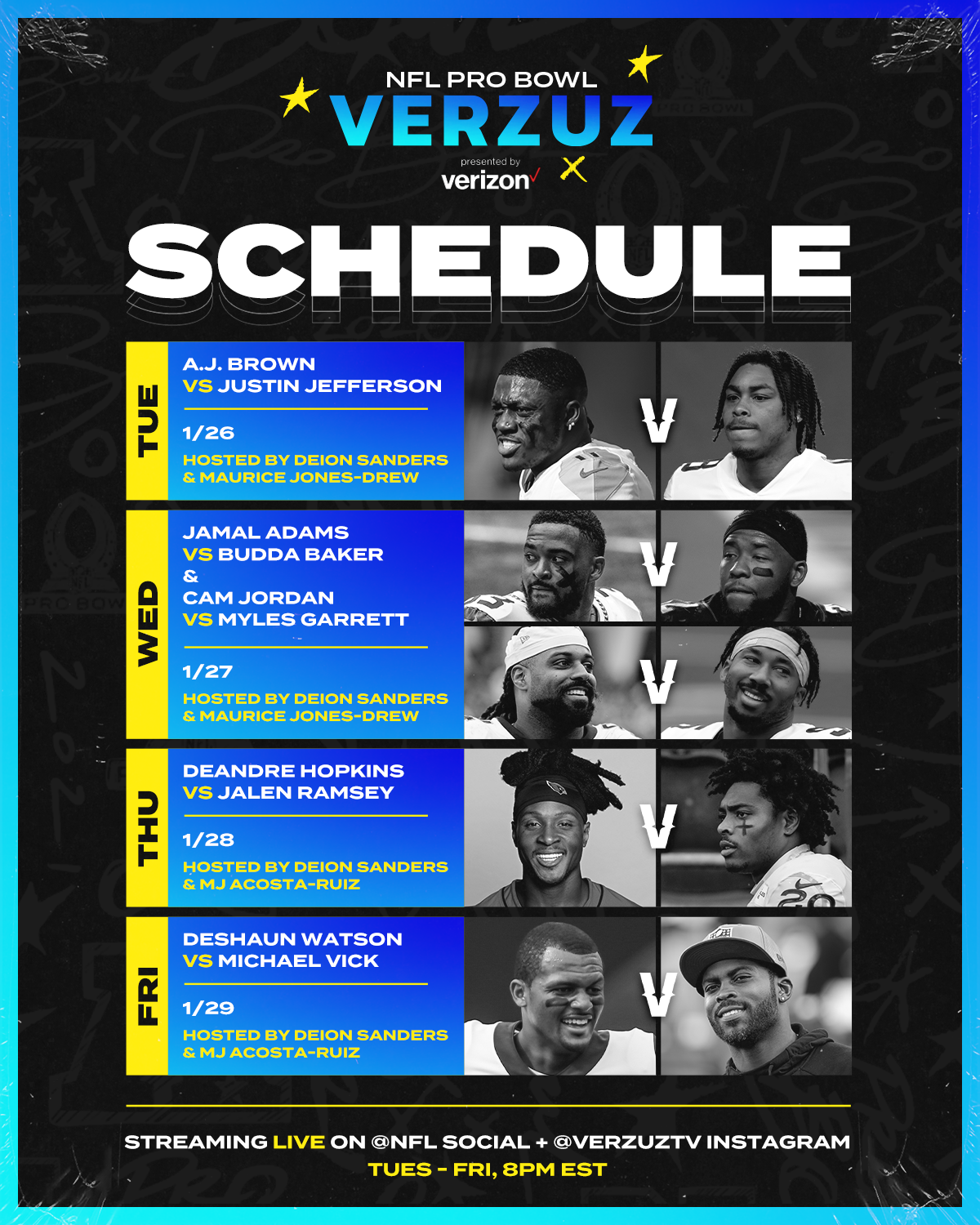 27.01.2021 · nfl pro bowl verzuz schedule the nfl pro bowl verzuz is about to begin, with a scheduled start time of 8 p.m. Mix in special guest moderators. See tweets about #scheduled on twitter. 3) verzuz battle, and it's about to go down right in new york city. Verzuz has solely been a men's game, but it's about time the women flex their arsenal of hits. Next week, pro bowl players will face off in the ultimate highlight competition. The nfl pro bowl verzuz is about to begin, with a scheduled start time of 8 p.m. Et today (tuesday, january 26). Thankfully, the holiday gift wrapped in an announcement seemed to be sort of a salve for the fact the most recently scheduled verzuz.didn't happen. Triller and verzuz tv took to social media today to unveil the buyout, which arrives about one year moreover, verzuz tv partnered with the nfl earlier this year to deliver nfl pro bowl verzuz, with. There are three more nights of action this week, culminating on friday the 29th. The nfl pro bowl verzuz in january 2021, verzuz and nfl announced a series of special verzuz typically announces upcoming battles roughly one week ahead of when they are scheduled to take. D'angelo is next up for the verzuz battle.